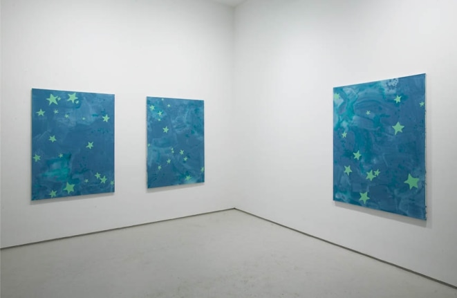 Ostendarp’s new body of work comprises a series of three canvases scaled to the measurements (106 ¼ x 139 ¾ inches) of Miró’s Mural Paintings. While based on the works by Miró these new paintings are pure Ostendarp. These three grand cosmic statements are accompanied by a fourth painting, the same size (25 ½ x 31 ¾ inches) as the only other work Miró completed in 1962. A second series in this new body of work comprises six paintings after actual constellations, sized the same as Miró’s 1968 series called Letters and Numbers Attracted by a Spark (Lettres et chiffres attirés par une étincelle). Where Ostendarp’s three large paintings will evoke bright daylight skies, these six paintings (57 ½ x 44 ¾ inches each) will be nocturnes, six real constellations whose stars shimmer in atmospheric voids and become anthropomorphic as they twist and wave their pointed arms. The varied distortions of the stars and the liquid quality of the grounds also suggest the star-filled night skies as if reflected in water, appearing both on and under the surface like water lilies in a pond.