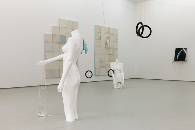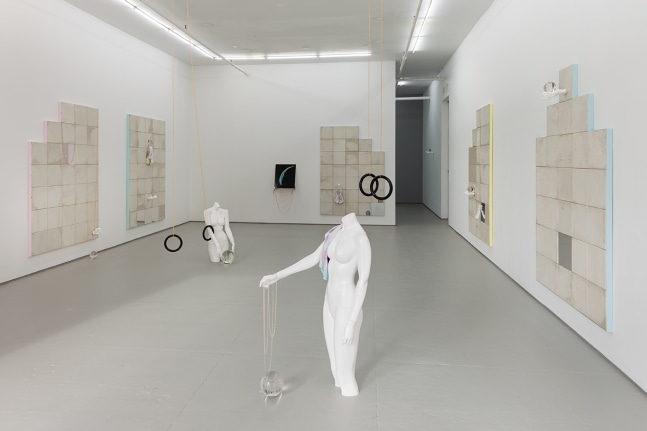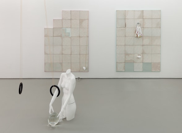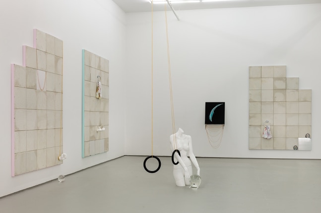In the main gallery, seven large wall works, made from the ceiling panels of the 1970’s public library that is the artist’s studio and home, are framed in shades of muted pastel color. Onto these panels, shop mannequin hands hold chains, tie-dye shirts and crystal balls: the works sit between a language of minimal painting and notes of what Mike Kelly referred to as the ‘uncanny’.