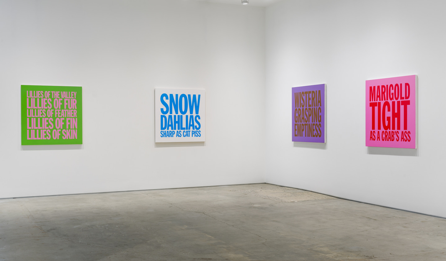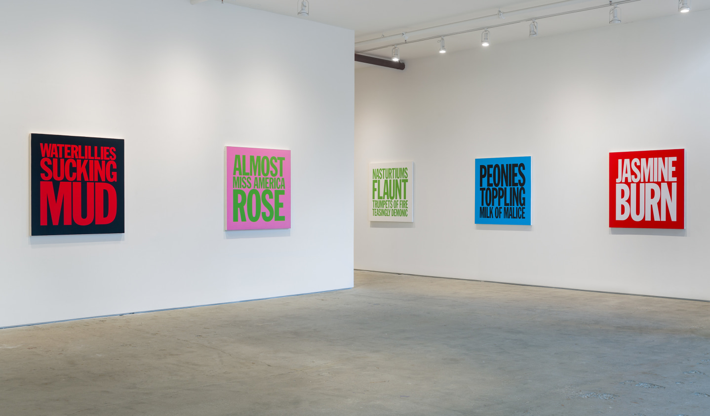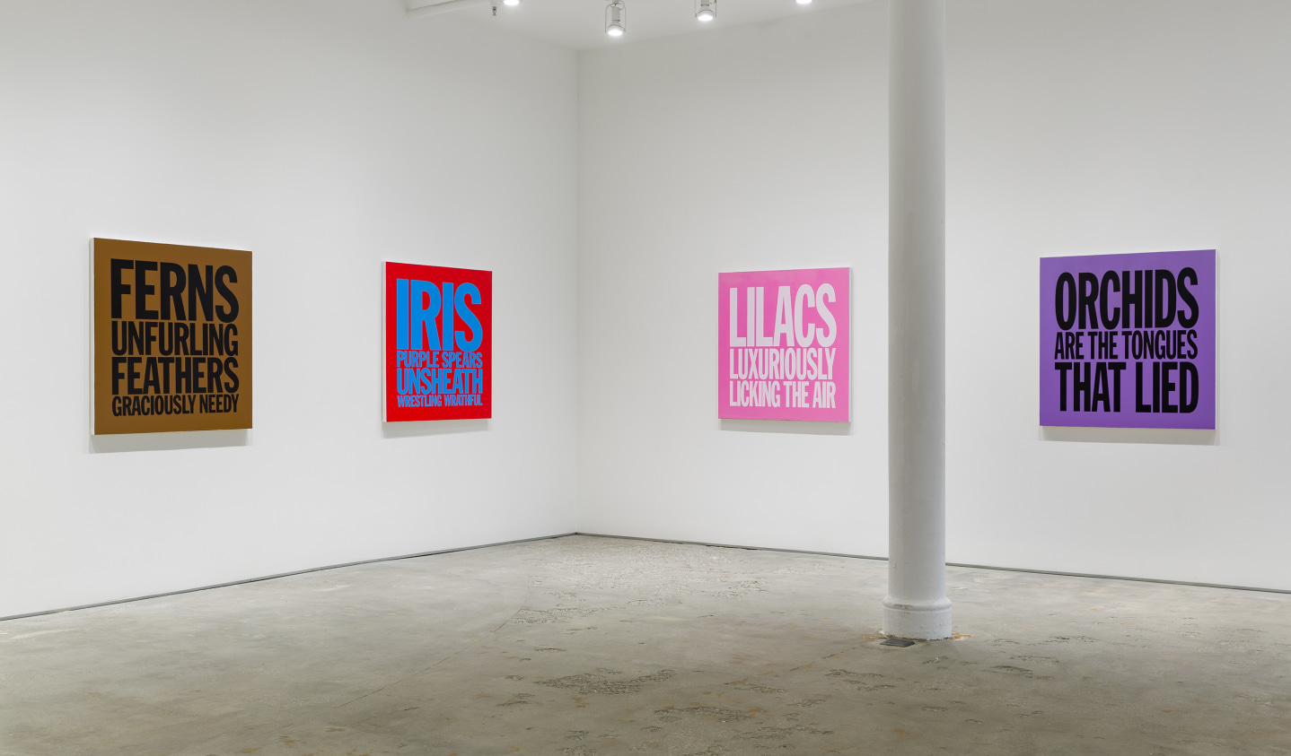 Following the conclusion of UGO RONDINONE: I ❤ JOHN GIORNO, the successful multi-venue retrospective collaboration in New York this year, John Giorno: Perfect Flowers, further focuses on a spectrum of the artist’s ongoing and new directions. Works as exquisite and cutting as CHERRY BLOSSOMS ARE RAZOR BLADES, CARNATIONS GLORIOUSLY SELF-SERVING and SNOW DAHLIAS SHARP AS CAT PISS, provoke and acknowledge earlier subtexts in the work in new compositions, such as, I WANT TO CUM IN YOUR HEART, BAD NEWS IS ALWAYS TRUE or GOD IS MAN MADE. The frankness of Giorno’s communication is at play, as it translates differently each time it is seen, heard or spoken in a rapidly evolving political and social landscape.