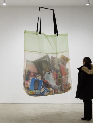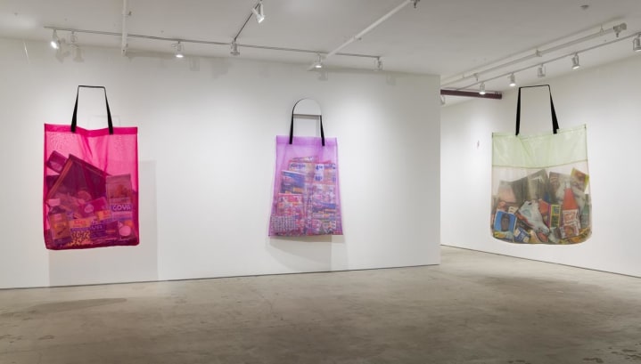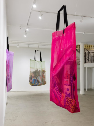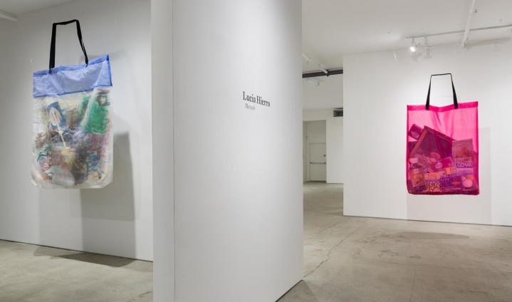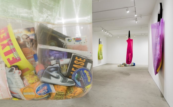 Elizabeth Dee is pleased to present Lucia Hierro’s new work in Mercado. In this presentation, the artist introduces a new archetype for her first solo gallery exhibition in New York. A series of soft assemblage sculptural objects on the walls and floor fill the front gallery, utilizing a broad platform of techniques that include digital media, painting, installation art, sculpture and color theory---as tools to tackle ideas of cultural and economic exclusion and privilege. Resembling outsized semi-translucent bags on epic scale, the new works borrow from pop culture, the history of art, everyday items of the working class in the US and the Caribbean, such as supermarket circulars and banal generic remedies. The monumentality of her work, and elevation of the status of objects through her unique visual strategy, engages the viewer in a discourse on issues of class, culture, identity and gender. The works in this series explore the symbiotic relationship between personal narrative, subjective and collective discourse that is as urgent as it is symbolic of our time.