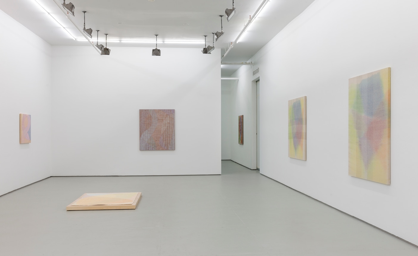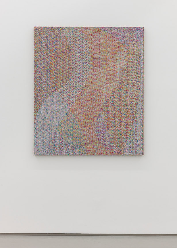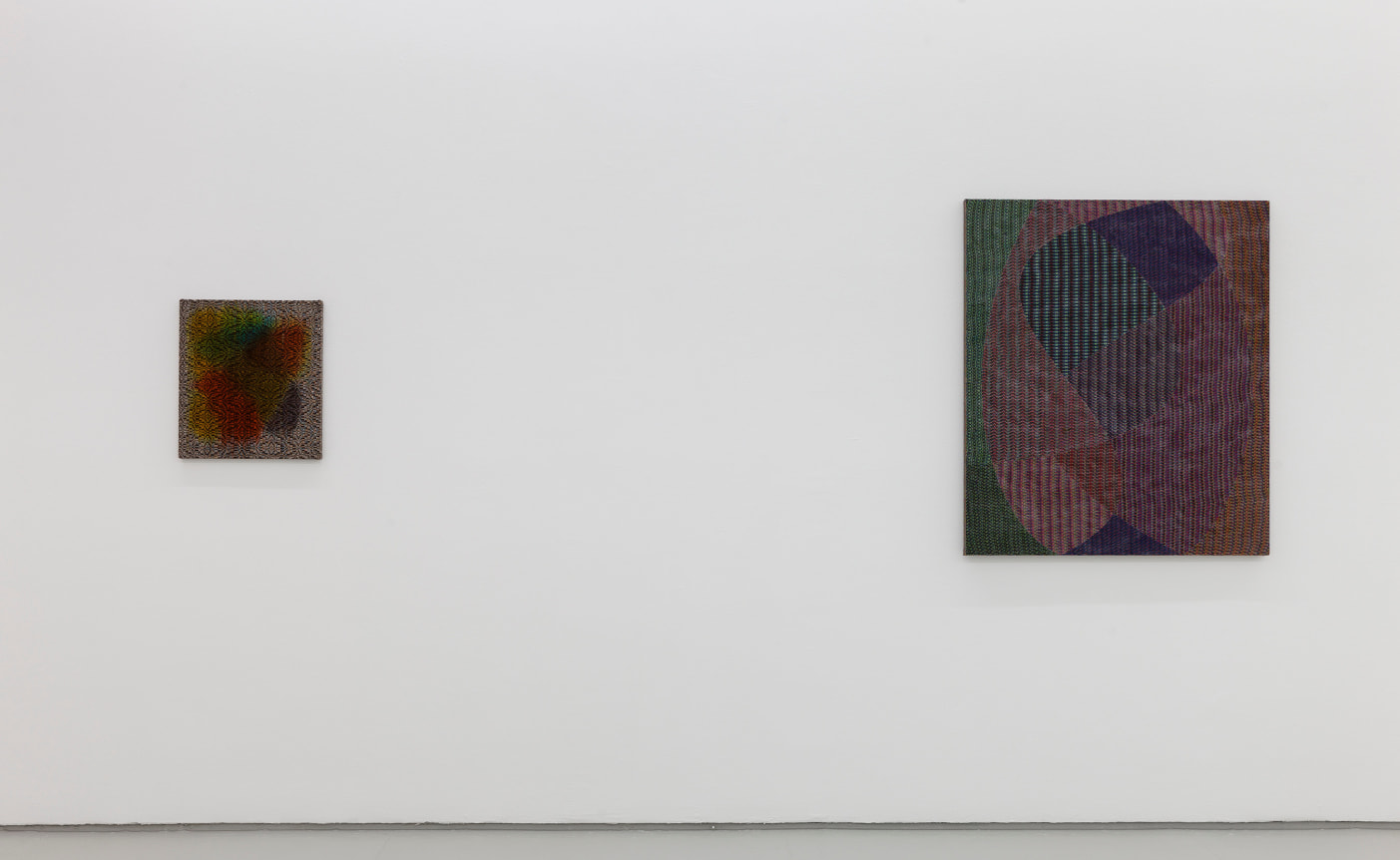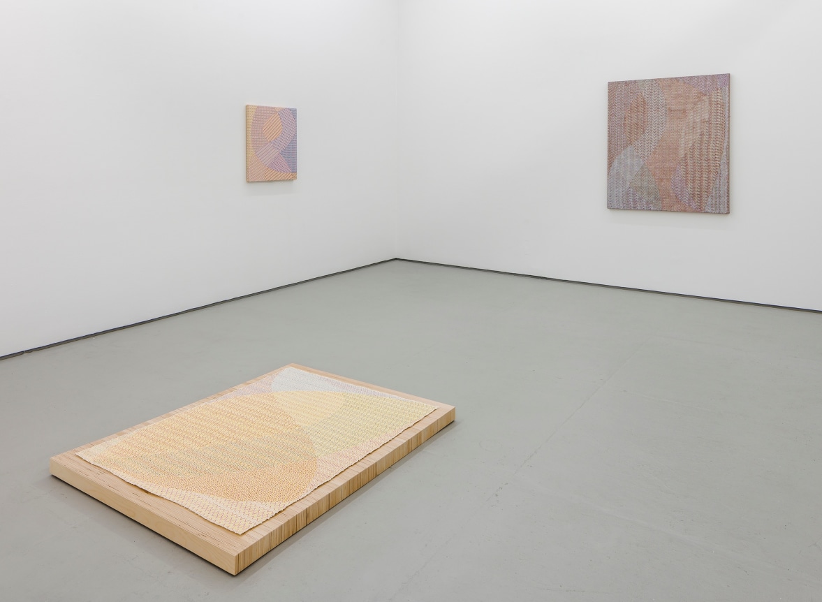 Several new types of work are included in the exhibition: sewn canvases, Swipe paintings, and Reweaves. The Swipe paintings trace Barrow’s finger swipes when making iPad drawings that serve as the source files for all the compositions in the show. In the Reweaves, Parke pulls apart a dyed piece of linen, thread by thread, and reweaves either the warp or weft into a new pattern and composition.