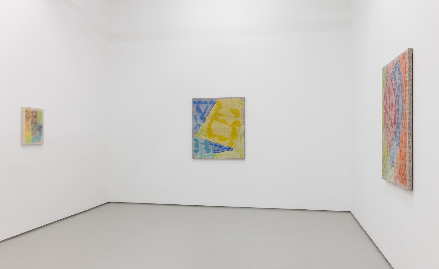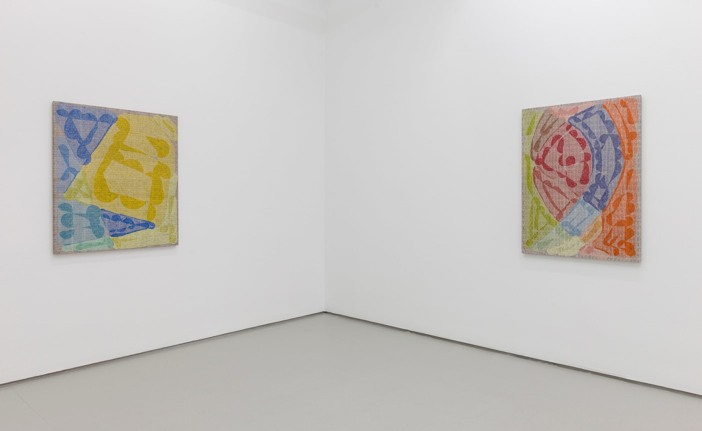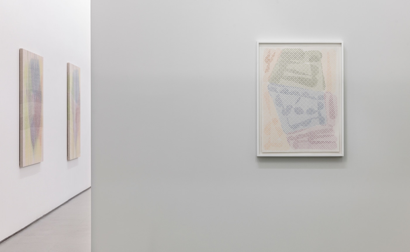 Several new types of work are included in the exhibition: sewn canvases, Swipe paintings, and Reweaves. The Swipe paintings trace Barrow’s finger swipes when making iPad drawings that serve as the source files for all the compositions in the show. In the Reweaves, Parke pulls apart a dyed piece of linen, thread by thread, and reweaves either the warp or weft into a new pattern and composition.