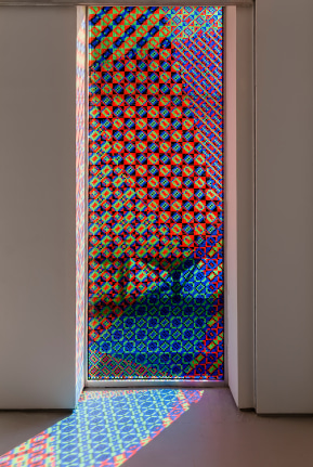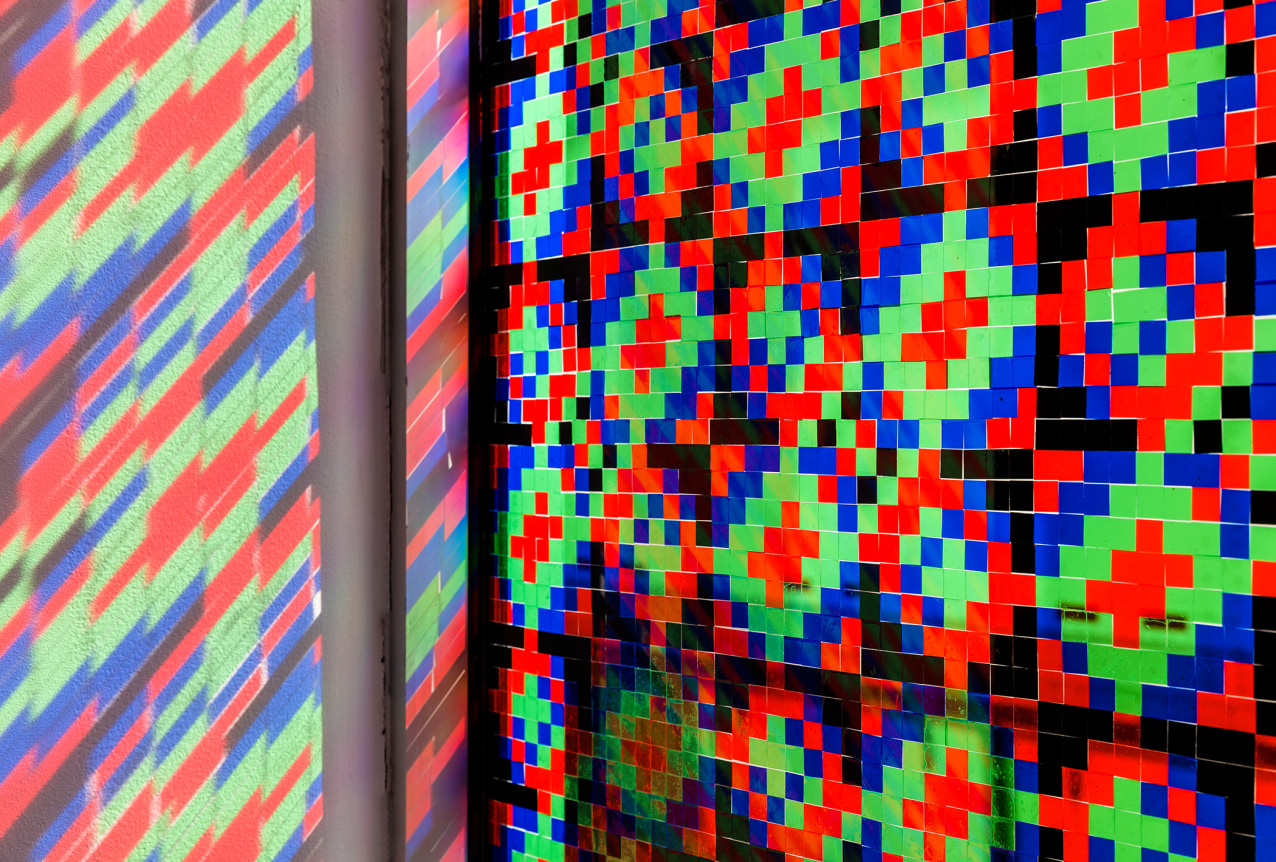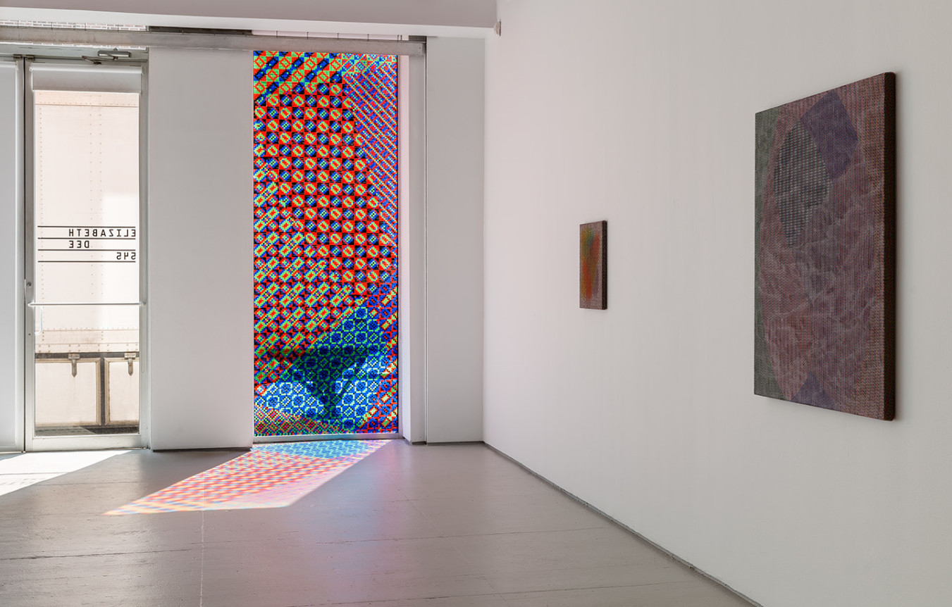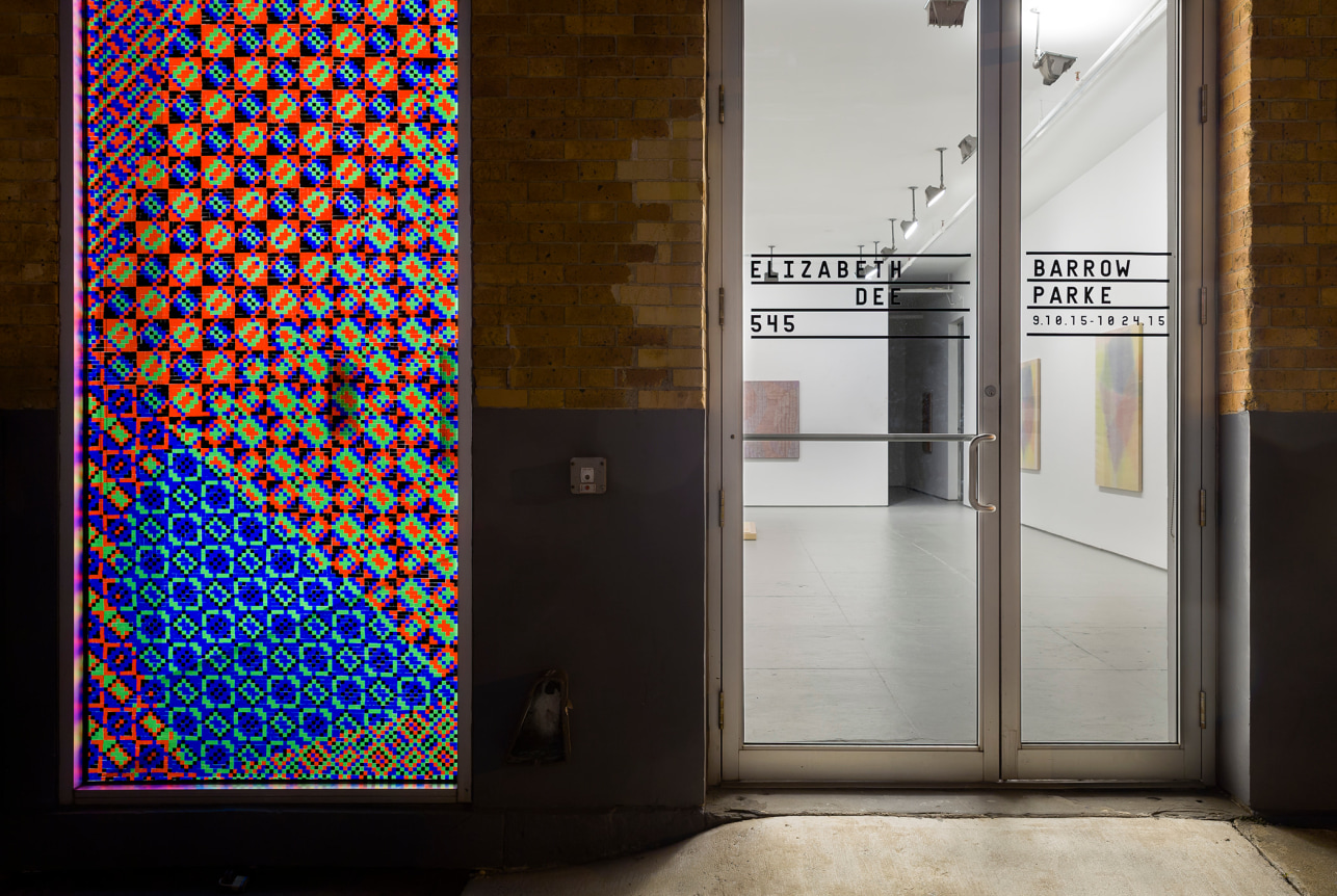 Despite diverse approaches, the repetition of small components from work to work serves as the pulse of the exhibition. The front window of the gallery is transformed into a stained glass composition made from a mosaic of red, green, blue and black vinyl applied square by square. The pair continues the series of white and black paintings (on CMY and RGB fabrics respectively) in which Barrow creates compositions by covering Parke’s colored fabrics in different ratios of white and black paint to allow the primary colored threads to optically mix into different colored shapes. An unstretched painting is presented on a custom plywood plinth made to emphasize the individual plies of which it is made.