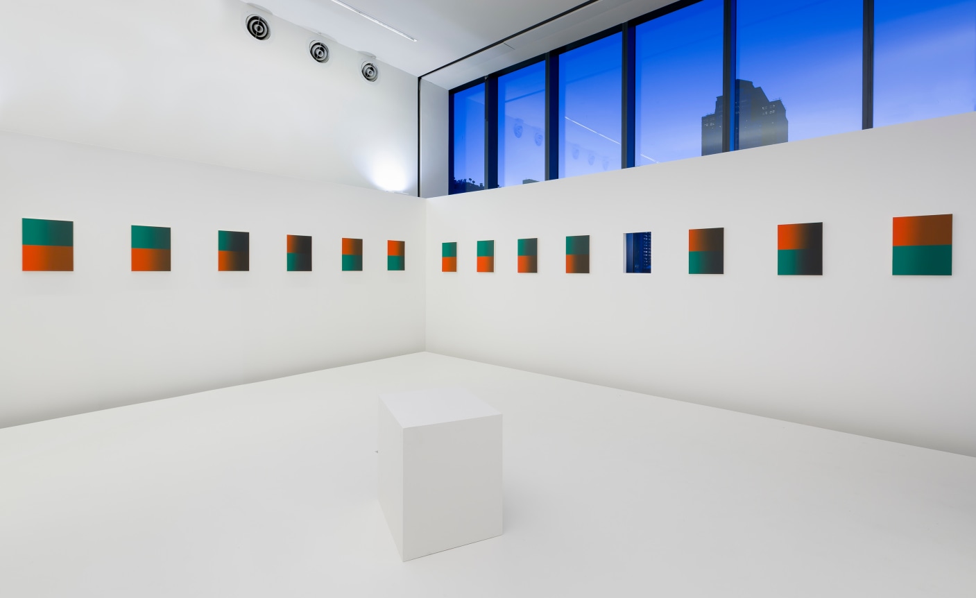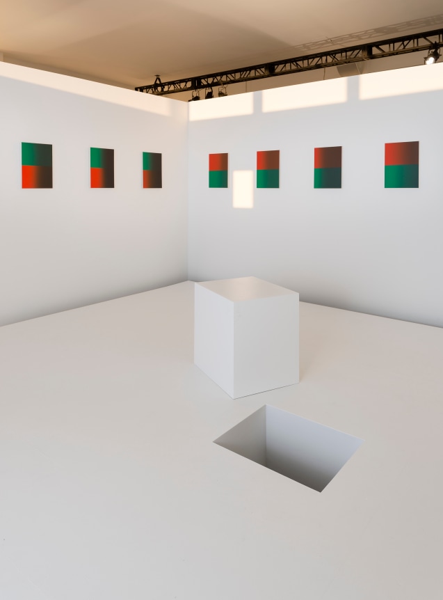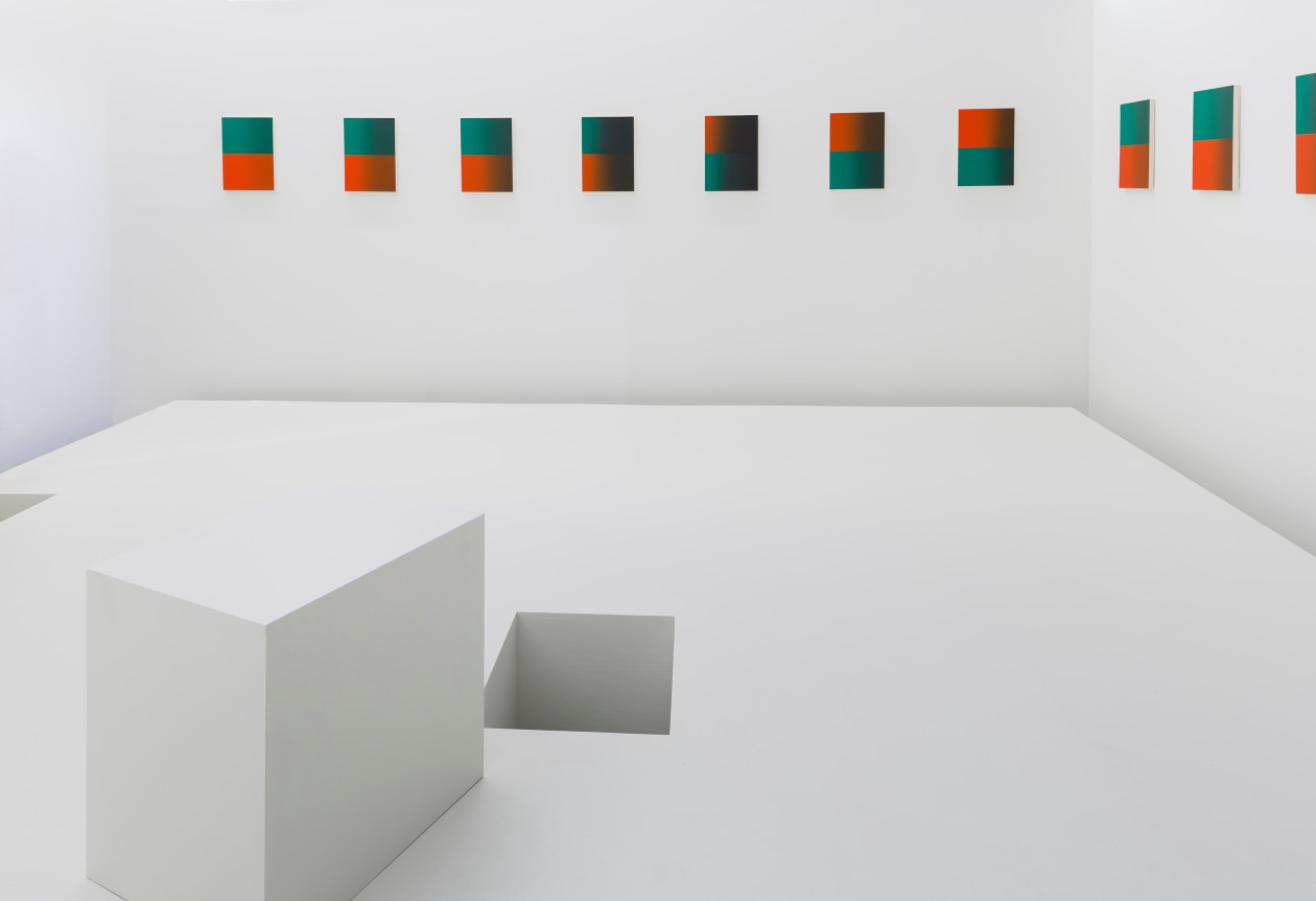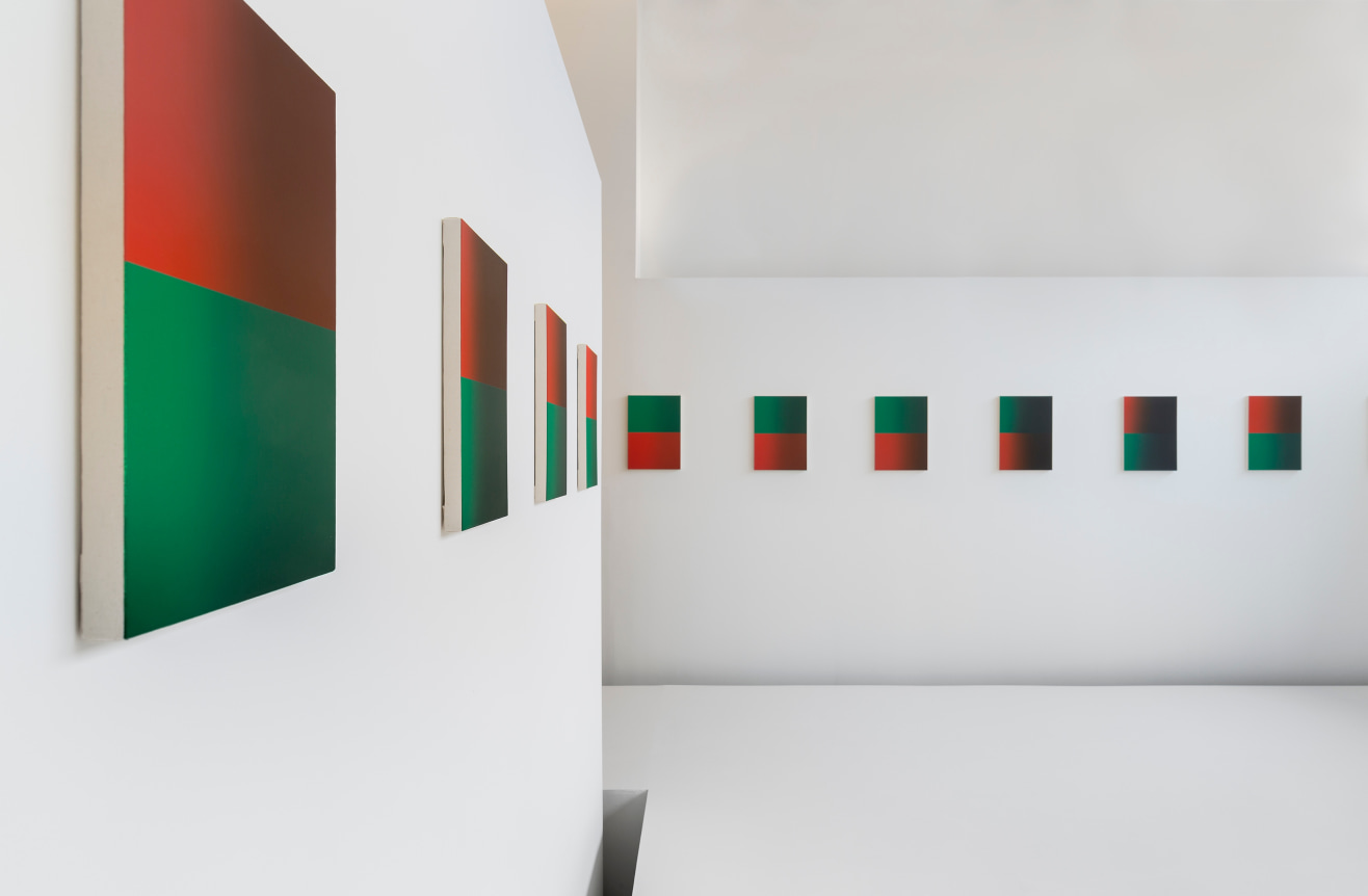 Philippe Decrauzat here provides a twofold conception, in the form of a series of painted canvases within an architectural installation. The paintings as a whole bring to mind Blinky Palermo’s sequence Times of the Day (1975). The use of found objects, pieces leant on walls , the echoing of architectural motifs and wall-painting are all procedures which Lynn Cook has assembled under the notion of “porosity”, to highlight the way Blinky Palermo has torn abstract painting away from any dogma of autonomy, and reveal its material and spatial nature. This is the permeability that Philippe Decrauzat has been exploring in his own way for a good fifteen years, both formally and conceptually. The first works bring out the edges of the painting and the space in which it is exhibited, with the illusion of a light source coming from the centre of the pictorial composition, or else a shaped canvas , thus seemingly suggesting a highly illusionary motif. Throughout his pictures, installations and films Philippe Decrauzat has conceived a form of painting extended up to the scale of the exhibition space, as well as to cultural productions (cinema, music) which determine the way it is perceived. The 24 paintings on show combine the colours red and green. Their composition evokes a simple signalling system, in particular those used on railways or canals, but their proportions are different. They are made up of two rectangles, one red and one green, in a 4/3 format unified by their darkening colours. Across a sequence of 24 images, here Philippe Decrauzat is articulating intervals, continuations and movement, along with that of the visitors, as in the grey optic veil enveloping each canvas.
