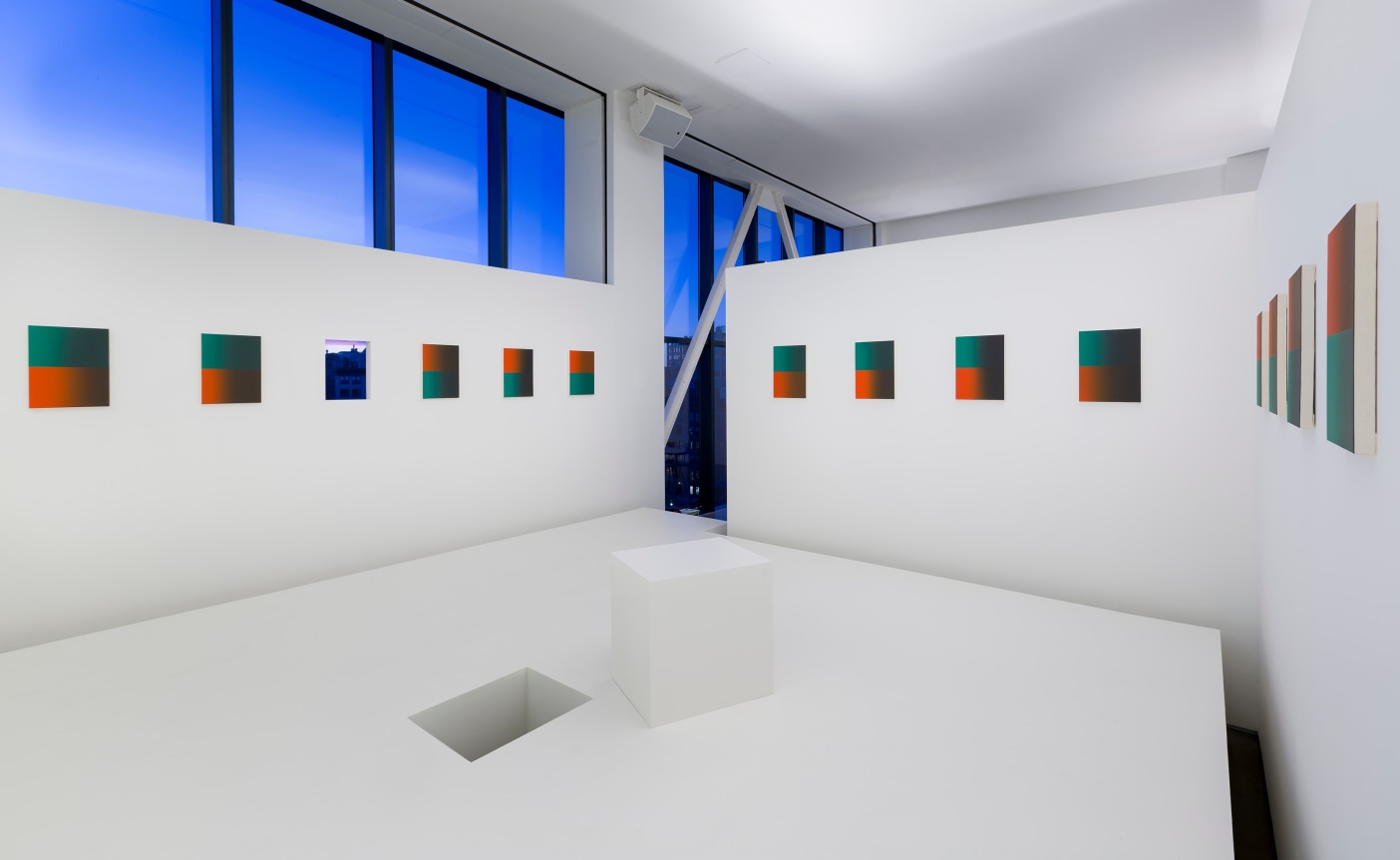The installation consists of a quadrangular architecture, with an empty space separating the floor from the walls. In the centre, a volume subtracted from the floor shows the height of a raised platform, which the visitors can use. On the walls, the series of paintings is interrupted by an opening. This centred architectural construction brings to mind Barker’s panorama (1787) or Daguerre’s diorama (1822), two illusionary conceptions, combining theatre and painting. In it, Philippe Decrauzat stages a merry-go-round, whose 24 canvases pass us by like flashes. 24 pulsations like the images of the zoetrope (1834), the famous drum which created the illusion of a moving picture. While Philippe Decrauzat’s installation evokes proto-cinematographic devices, its opening recalls the camera obscura, as used by Goethe to demonstrate the principle of retinal retention and embodied perception. Jonathan Crary, who has also studied such subjective visions combining physiological factors and external data, has shown up the recent transformations in attention spans, caused by new technologies. In the era of universal, 24/7 connectivity, Philippe Decrauzat offers the experience of an architectural animation in which painting is made to last for one decelerated second.